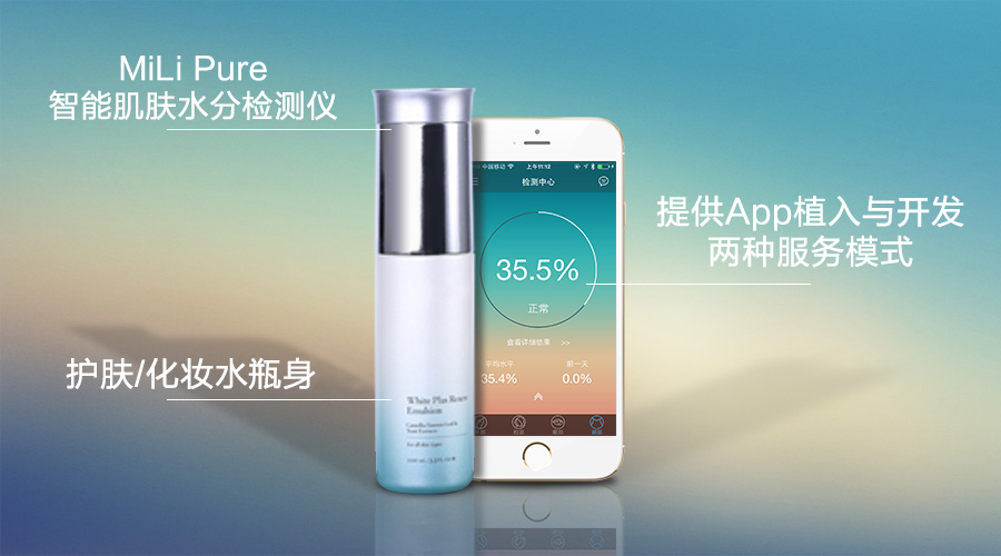 硬件方面,将MiLi Pure智能肌肤水分检测仪与已有产品瓶身结合,巧妙的三层设计,将分装瓶与智能肌肤检测设备完美结合,取下瓶帽上的MiLi Pure即可检测护肤前后的肌肤水分状况,通过科学数据了解护肤品补水护肤效果。