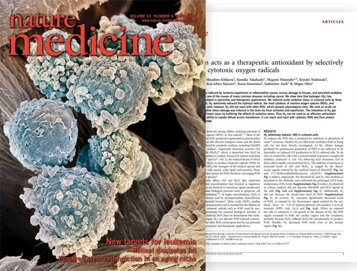 2007年,日本医科大学太田成男教授,在《自然医学》上发表长文“氢气的选择性抗氧化”,证明了氢气的抗氧化作用,可有效清除自由基,显著改善损伤细胞,缓解炎症。